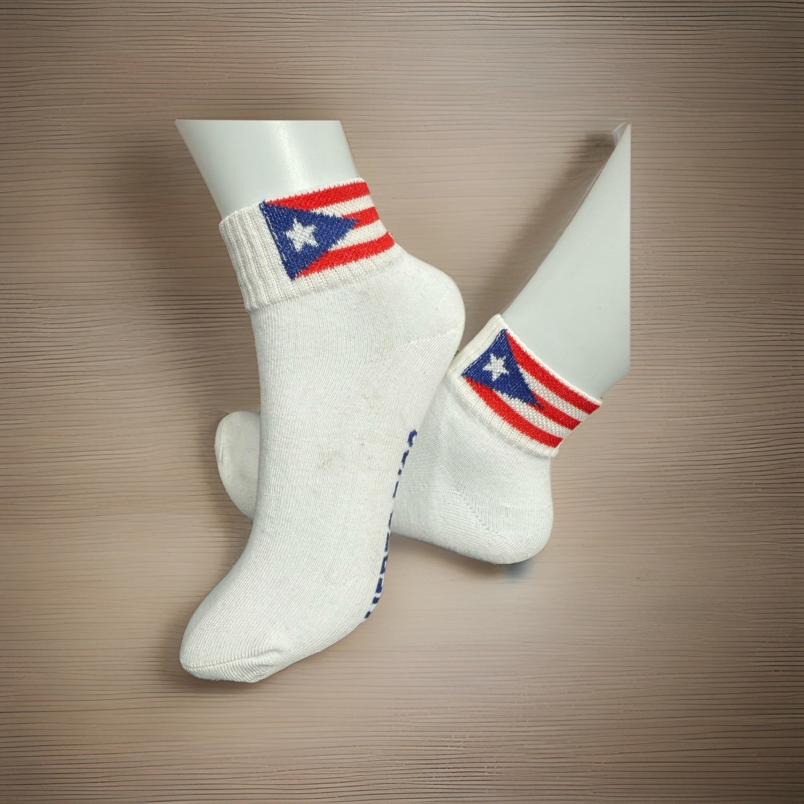 The Puerto Rico Socks 3 pack with Flag features a set of three white low-cut athletic socks made of cotton, perfect for men who enjoy walking. The socks showcase the Puerto Rican flag theme, making them a stylish and comfortable choice for all seasons. Designed for regular size men, these socks are a great accessory to showcase your pride in Puerto Rican culture.